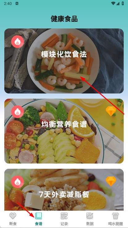 2、切換到食譜頁,選模塊化飲食法等健康食譜,參照執(zhí)行,在記錄頁,點記飲食,記體重等,記錄日常數(shù)據(jù),掌握身體狀況。