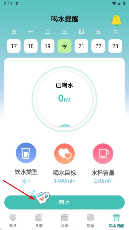 3、進入數(shù)據(jù)頁,看體重、斷食時長趨勢,用喝水提醒功能,設(shè)飲水類型、目標、杯量,定時點喝水記錄,科學(xué)輕斷食、健康減肥。