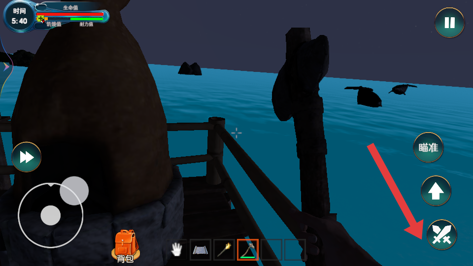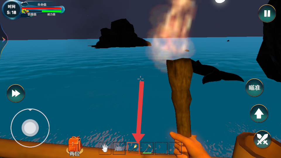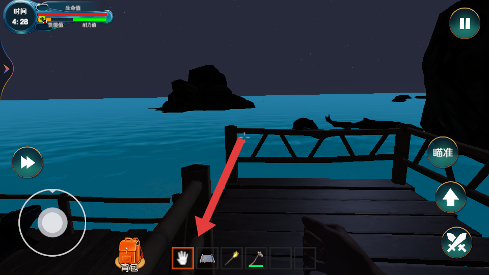 1、開局在碼頭,優(yōu)先點(diǎn)擊背包旁火把或者斧頭,裝備后探索場(chǎng)景,用斧頭砍碼頭木箱、礁石旁植被木材。