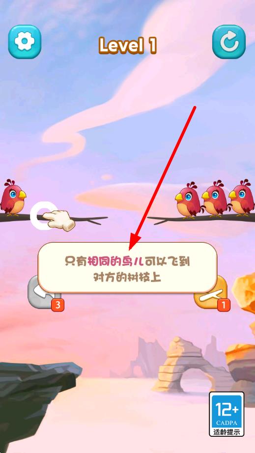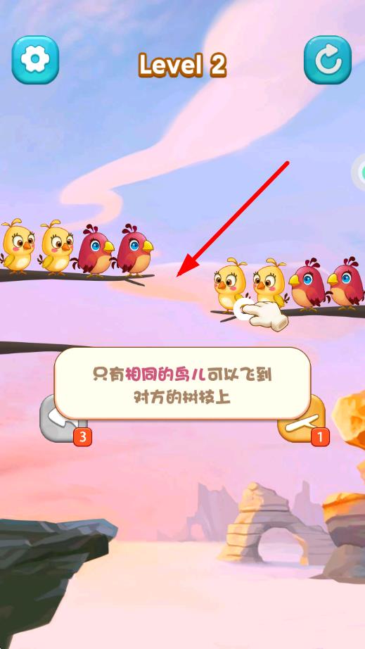 1、依據(jù)規(guī)則只有相同的鳥兒可以飛到對方的樹枝上,點(diǎn)擊左側(cè)紅鳥,將其移至右側(cè)紅鳥所在樹枝,使同色鳥歸為一處。