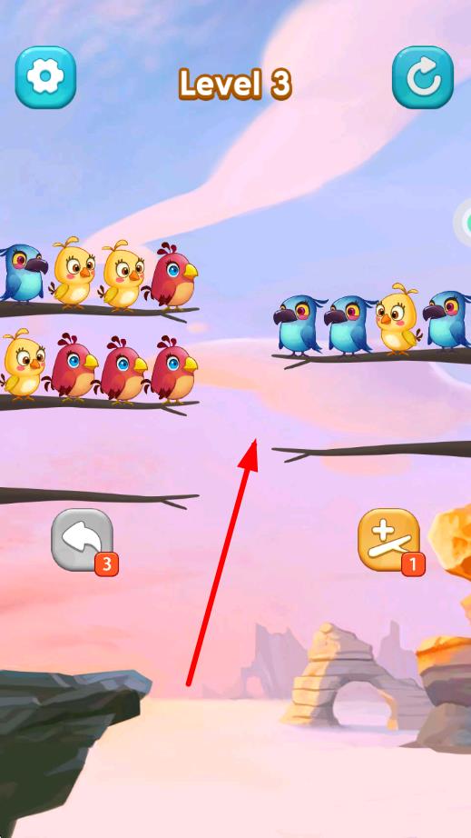 3、按照同色鳥可飛規(guī)則,先移動藍(lán)色、黃色、紅色鳥兒,利用中間樹枝過渡,讓每側(cè)樹枝上鳥兒顏色統(tǒng)一,達(dá)成關(guān)卡目標(biāo)。