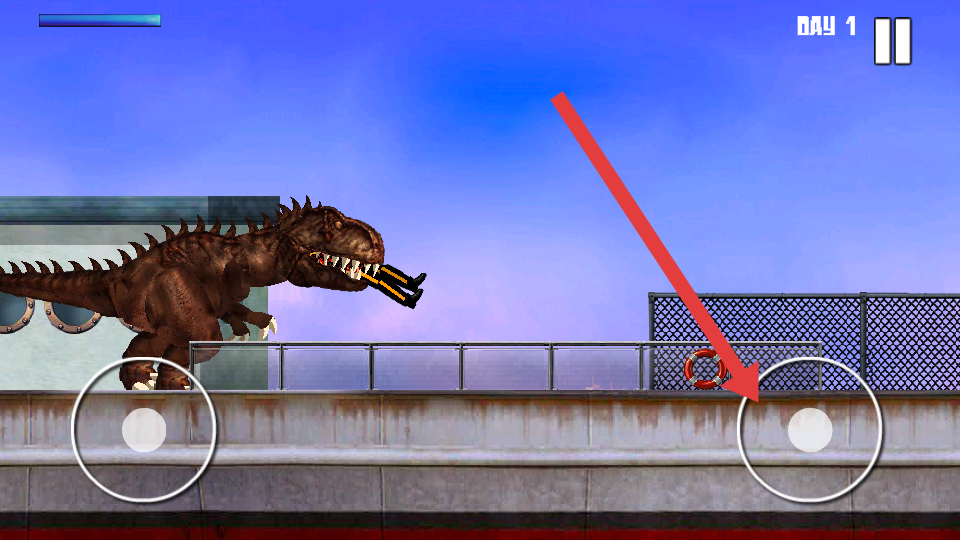 1、進(jìn)入游戲操控恐龍,左側(cè)虛擬搖桿控制移動方向,右側(cè)按鈕可觸發(fā)攻擊動作,先熟悉移動與攻擊操作。