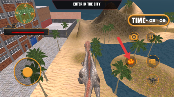3、切換Enter In The City恐龍任務(wù),沿沙灘-城市路徑探索,遇建筑可破壞拿獎(jiǎng)勵(lì),觸發(fā)隱藏?cái)橙思皶r(shí)戰(zhàn)斗。