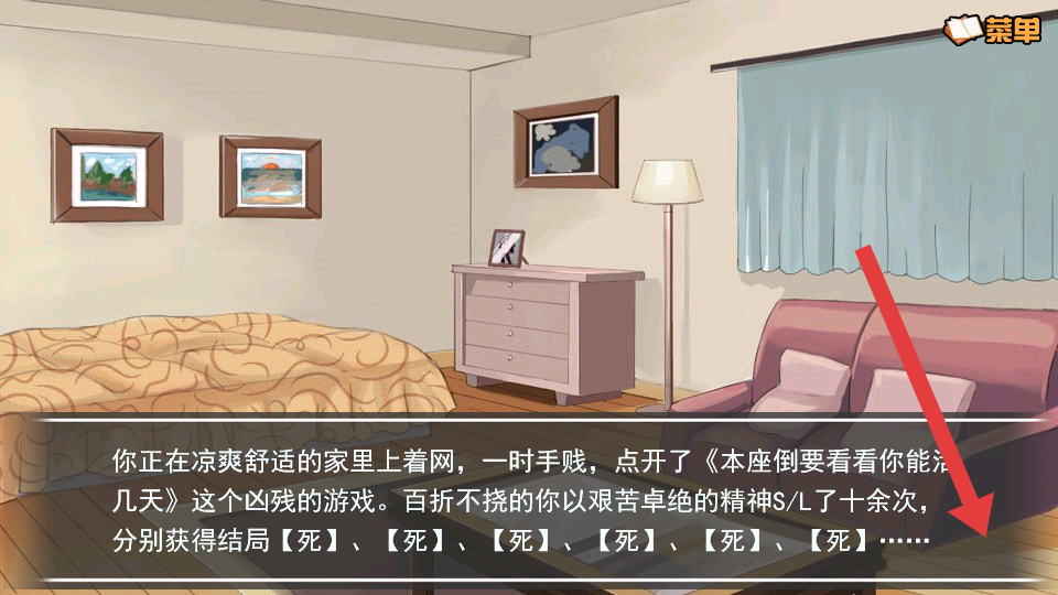 1、初始現(xiàn)代臥室場景,快速瀏覽劇情了解穿越背景,點擊菜單可查看存檔、設置,確認后推進對話。