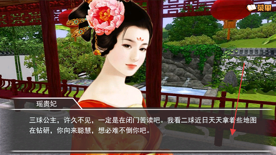 3、園林遇瑤貴妃對話,留意提及地圖鉆研等信息,選擇回應,結(jié)合前期劇情塑造角色如聰慧、裝傻。
