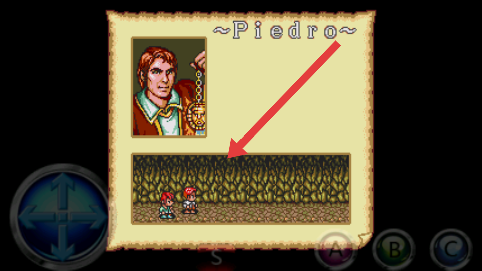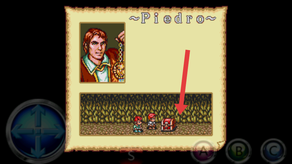 2、進(jìn)入Piedro洞穴場(chǎng)景,用方向鍵控制移動(dòng),沿路徑探索,遇寶箱如紅箱優(yōu)先開啟,獲取道具裝備,提升能力。