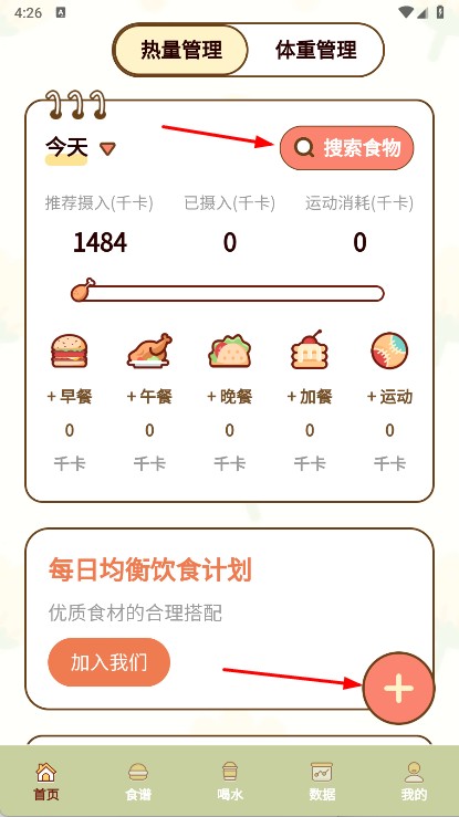 1、打開熱量減肥小本fit卡路里,在首頁點搜索食物,查食物熱量,點加號,選日期和餐型,記錄飲食,掌握熱量攝入。