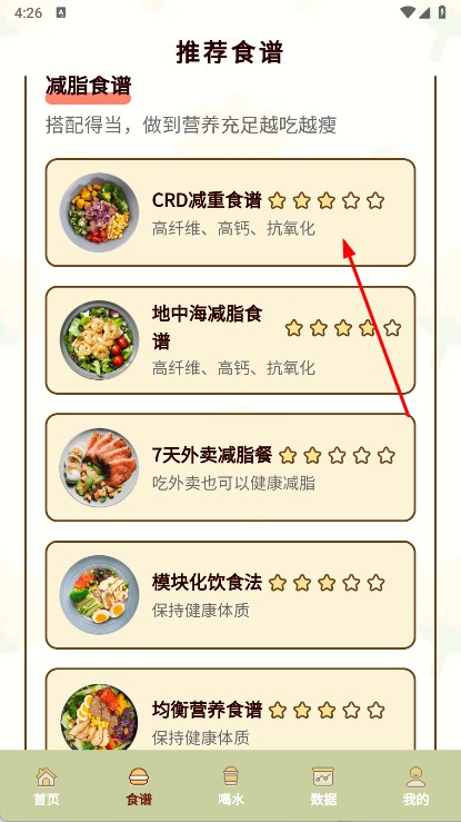 2、切換到食譜頁,選推薦減肥食譜,如CRD減重食譜,規(guī)劃健康飲食,輔助瘦身。