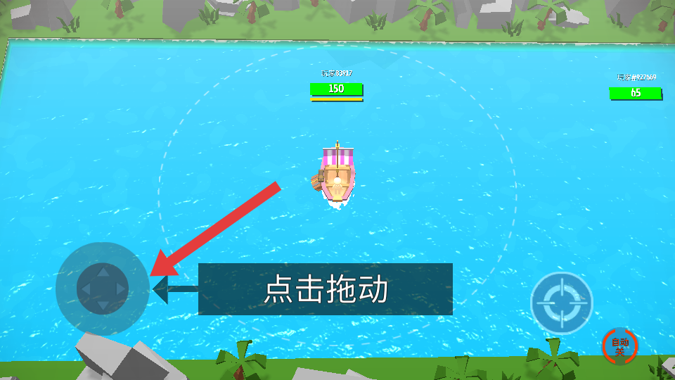 1、開局用左側搖桿點擊拖動控制船只移動,先熟悉轉向、加速邏輯,調(diào)整航線往敵方船只方向。