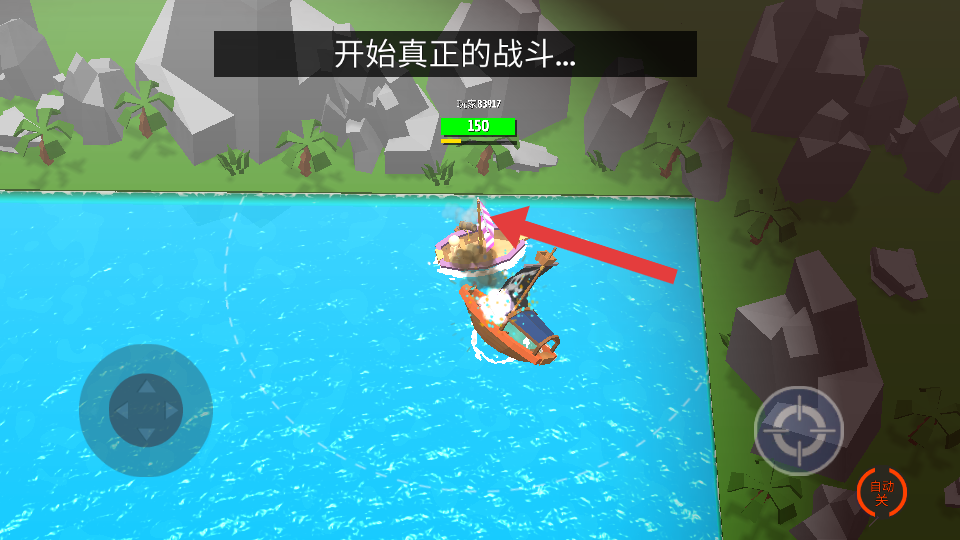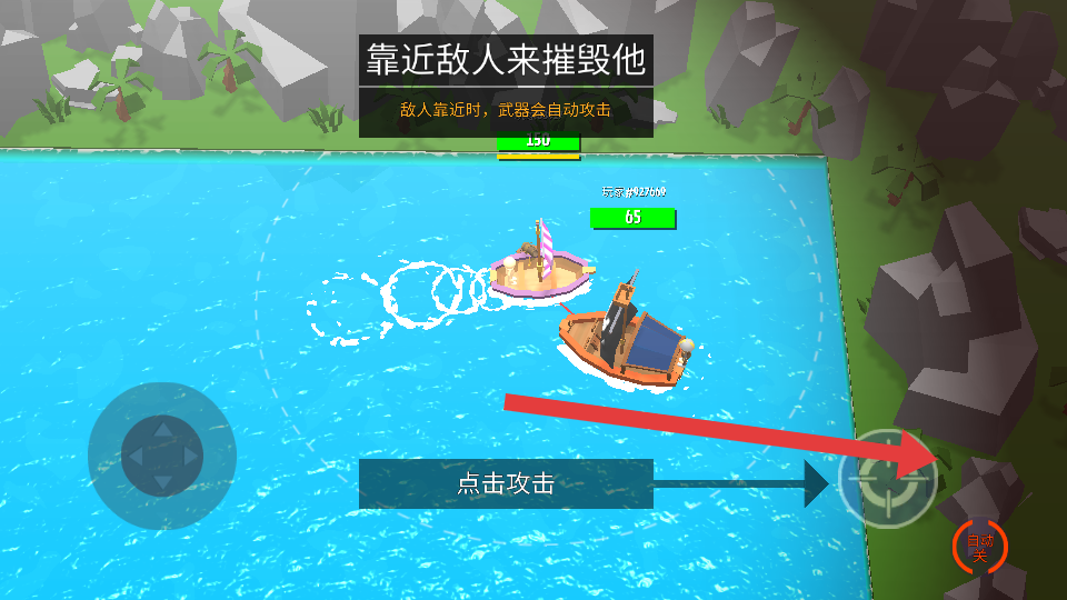 3、戰(zhàn)斗中關注血量條綠色,若敵方反擊,通過搖桿靈活走位繞圈、變向躲避,優(yōu)先集火摧毀敵方船只。