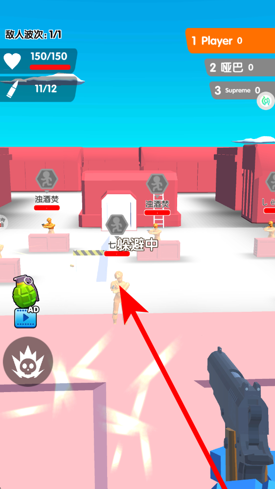 2、戰(zhàn)斗簡單操作操控武器射擊敵人,借助場景掩體躲避傷害,左側(cè)手雷道具可觀看廣告獲取,精準(zhǔn)打擊積累擊殺數(shù),應(yīng)對多敵圍攻。
