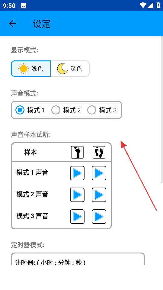 2、切換模式只要點(diǎn)對應(yīng)圖標(biāo)就行,選中的模式會有藍(lán)色邊框標(biāo)出來,夜間跑步用深色更護(hù)眼,試聽不同腳步聲特別方便,每種模式都配了兩個(gè)樣本。