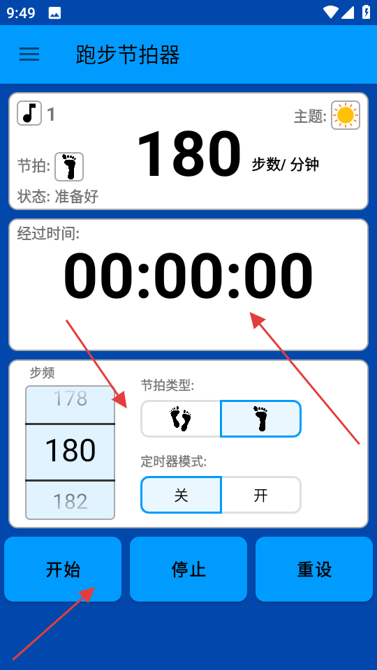 1、這里最實(shí)用的就是能直接看到當(dāng)前步頻,點(diǎn)擊步頻數(shù)字就能上下調(diào)整,想調(diào)快或調(diào)慢都特別順手,開始和停止控制節(jié)拍器運(yùn)行,重設(shè)則能一鍵清零計(jì)時(shí)。