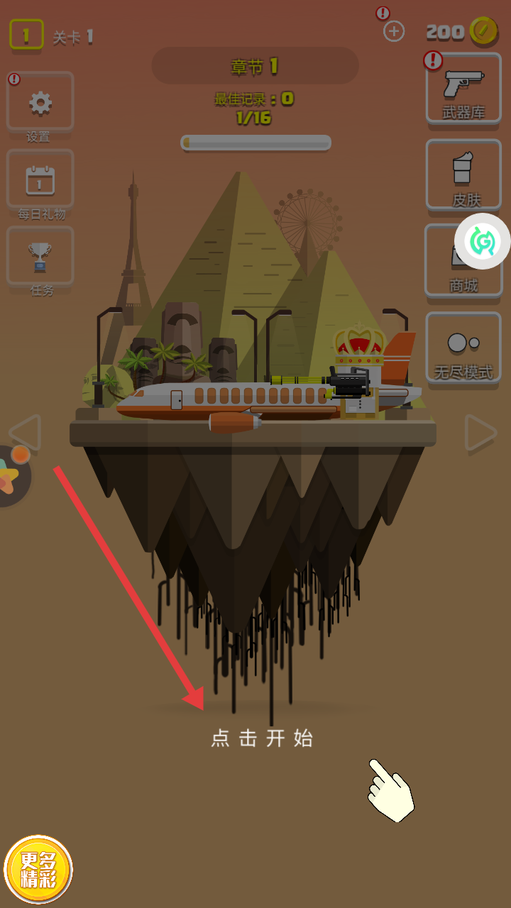 1、點擊主界面點擊開始,進入關(guān)卡1,提前查看武器庫,熟悉初始裝備,為射擊敵人做準備。