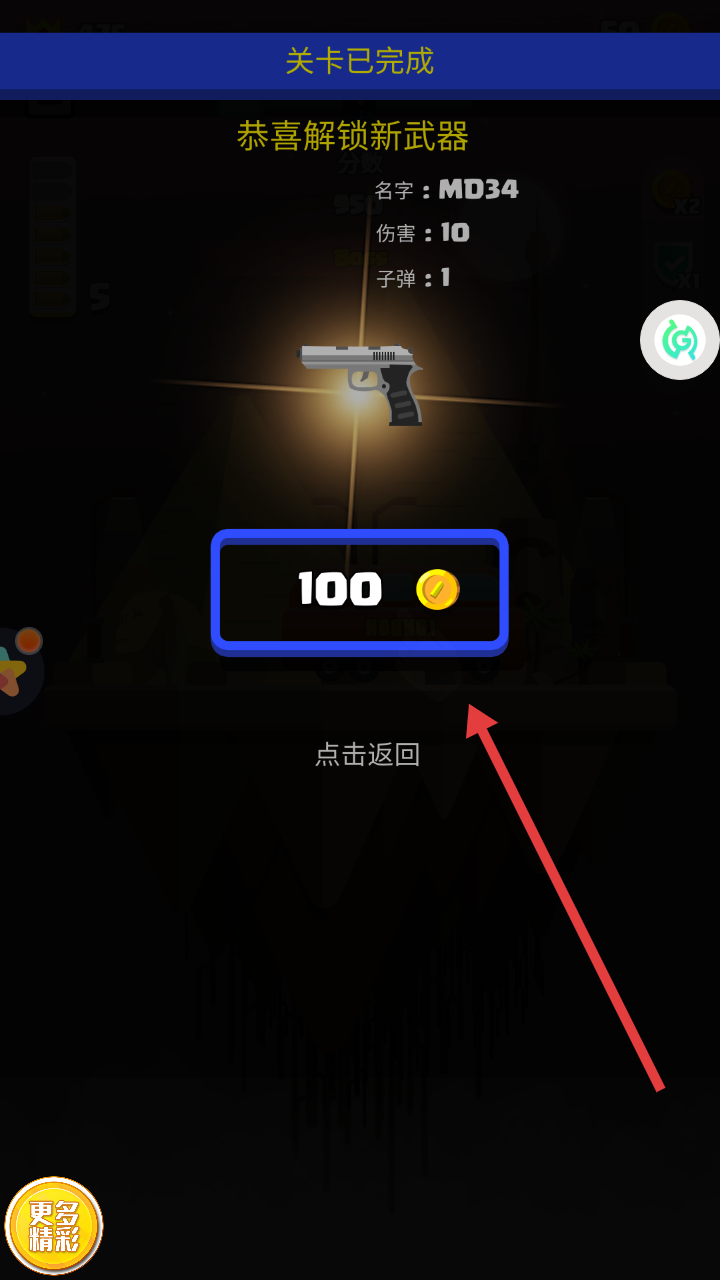 3、關(guān)卡完成后,領(lǐng)取新武器MD34與100金幣獎勵,點擊返回,可強化武器或解鎖皮膚,繼續(xù)挑戰(zhàn)。