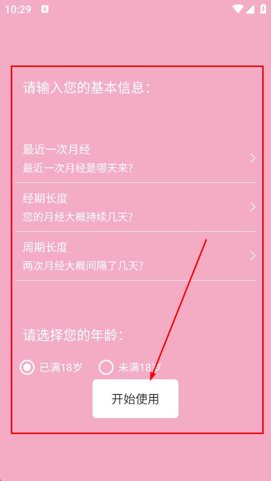 1、進入填最近一次月經,經期長度,周期長度,選年齡,點開始使用完成初始信息設置,開啟經期管理。