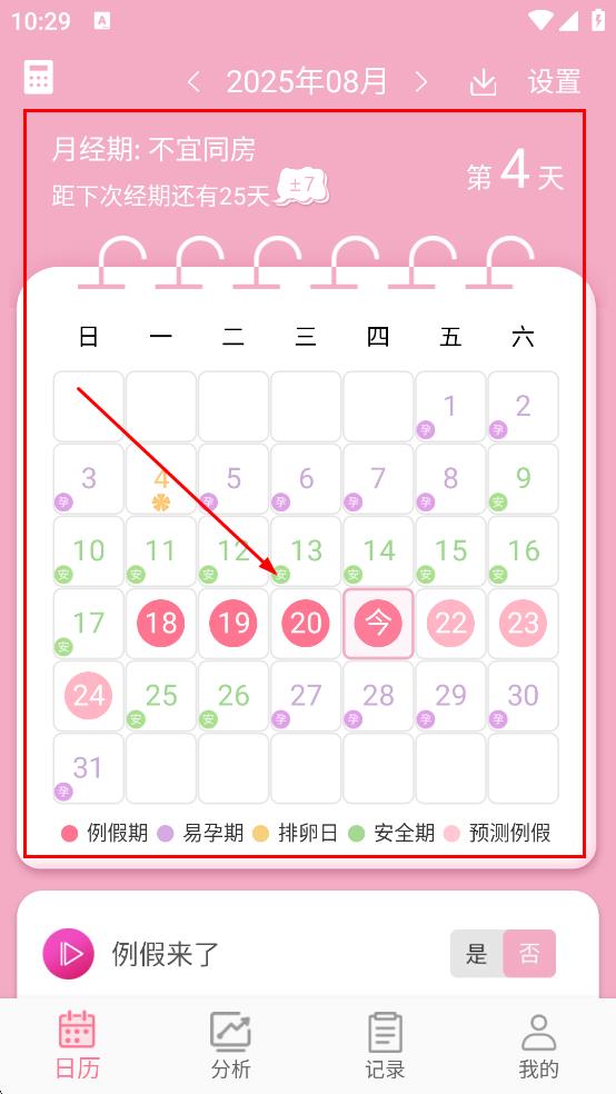 2、查看經期狀態(tài),日歷標有例假期、易孕期等,點對應日期,可看當天經期相關提示,輔助了解身體周期。