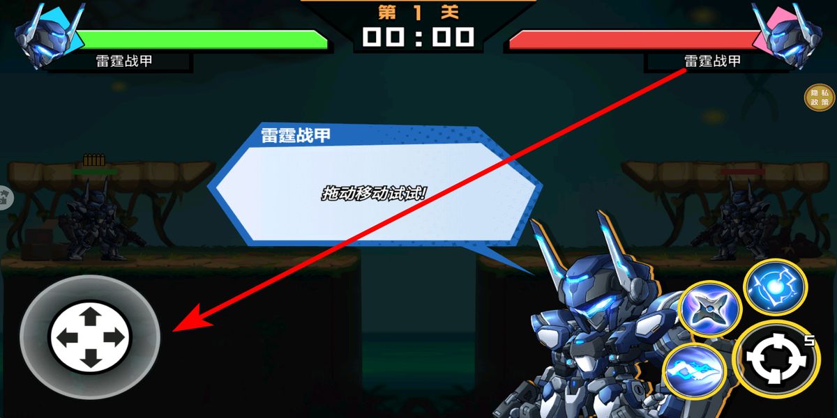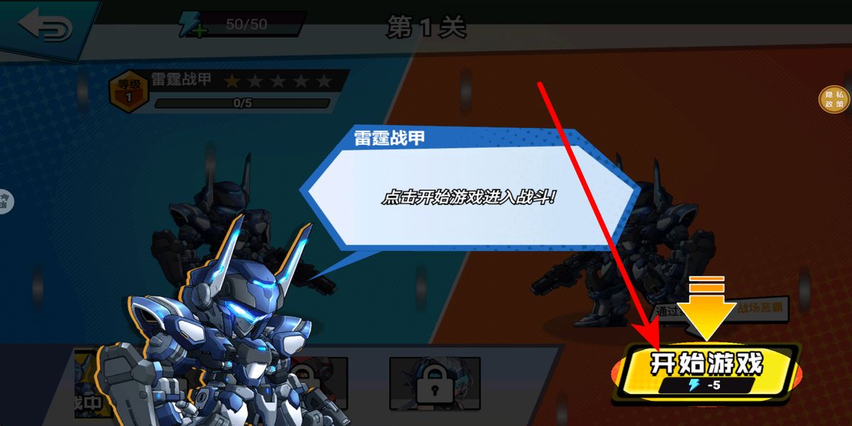 1、進(jìn)入主界面,點(diǎn)擊開(kāi)始游戲消耗5點(diǎn)能量,選定關(guān)卡后加載戰(zhàn)場(chǎng),查看機(jī)甲等級(jí)、血量等信息,跟隨提示熟悉搖桿移動(dòng)操作,為對(duì)戰(zhàn)做好籌備。