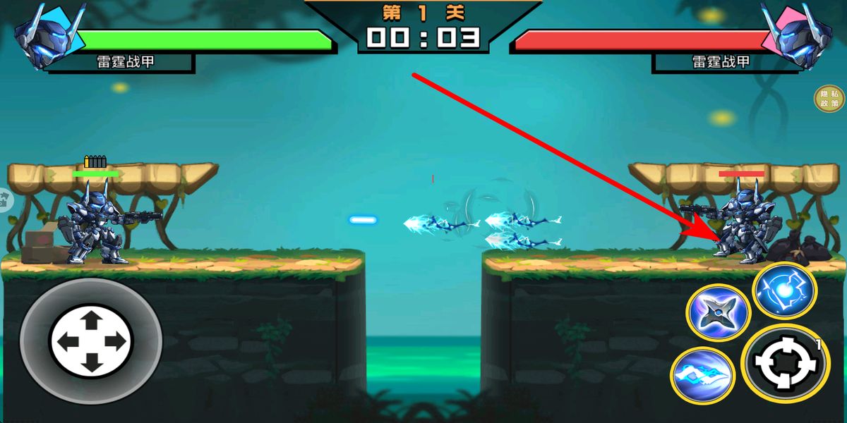 2、戰(zhàn)斗時(shí)拖動(dòng)左側(cè)搖桿控制機(jī)甲移動(dòng),利用場(chǎng)景掩體規(guī)避傷害,點(diǎn)擊右側(cè)技能按鈕釋放攻擊,留意技能冷卻時(shí)間,合理銜接輸出,壓制敵方機(jī)甲。
