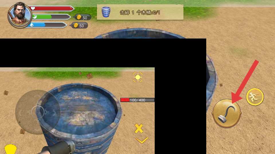 1、接取擊碎1個(gè)木桶任務(wù),點(diǎn)擊右側(cè)鉤子或者攻擊按鈕,對(duì)準(zhǔn)木桶交互擊碎,完成后領(lǐng)獎(jiǎng)勵(lì)金幣、經(jīng)驗(yàn)。