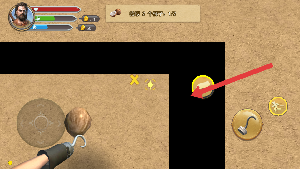 2、遇拾取2個(gè)椰子任務(wù),找到椰子樹(shù)或地面椰子,用鉤子勾取靠近點(diǎn)擊拾取鍵,收集滿2個(gè)提交,補(bǔ)充資源。