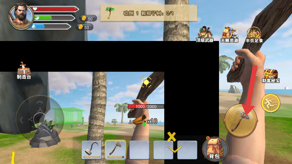 3、砍倒1顆椰子樹(shù)時(shí),切換斧頭道具,對(duì)準(zhǔn)樹(shù)干長(zhǎng)按攻擊,砍到血量為0獲取木材x10,完成任務(wù)解鎖新配方。