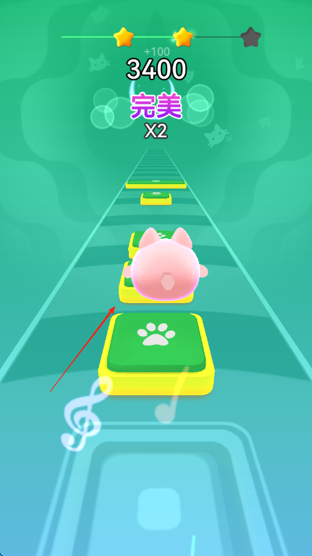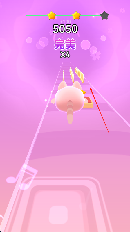 1、控制粉色小貓?jiān)趲ж堊τ〉钠脚_(tái)跳躍、按節(jié)奏精準(zhǔn)跳躍得【完美】判定、積累分?jǐn)?shù)前進(jìn)即可。
