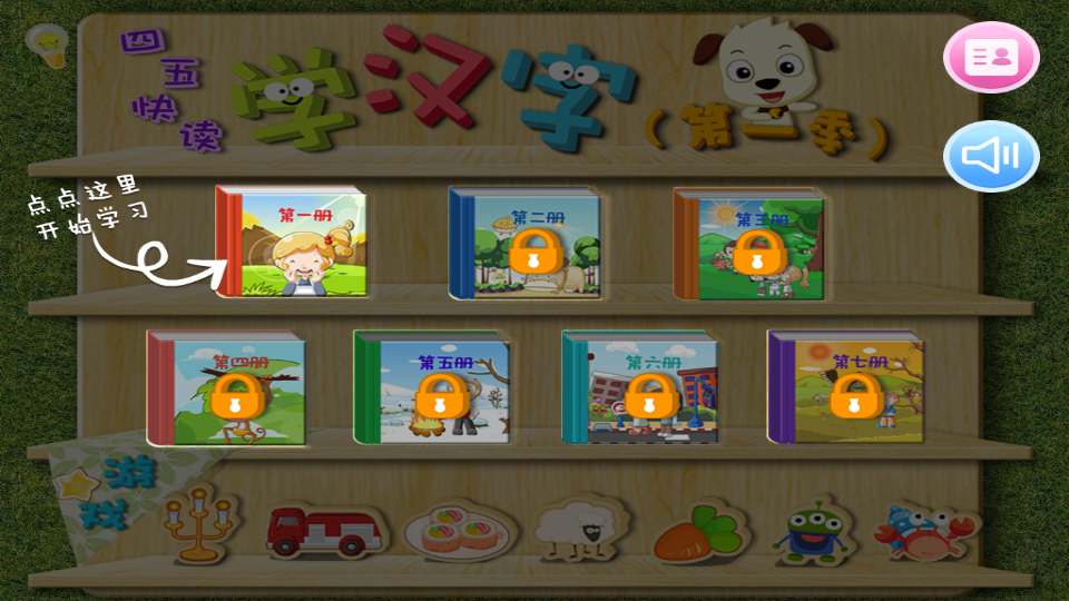 1、第一冊沒上鎖可以直接點進去學,左下角那個黃色燈泡和點點這里開始學習的提示超貼心,小朋友一看就知道該點哪里,旁邊的小狗圖案也讓整個界面更活潑了。
