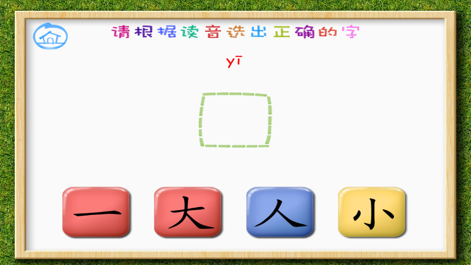 3、頂部紅色拼音yī特別醒目,小朋友要根據(jù)讀音在下面四個彩色按鈕里選對字,選錯了也沒關系可以重來,藍色小房子圖標還能隨時返回主頁。