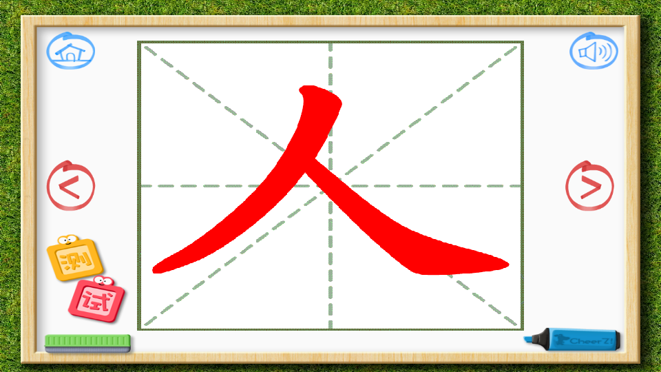2、中間的米字格里用紅色大字展示人字,想練習就點下面那個紅色試字按鈕,直接在屏幕上寫就行,左側(cè)黃色測字按鈕可以檢查學習成果。