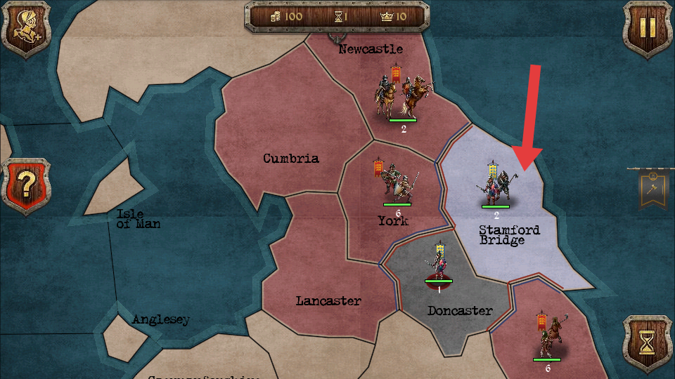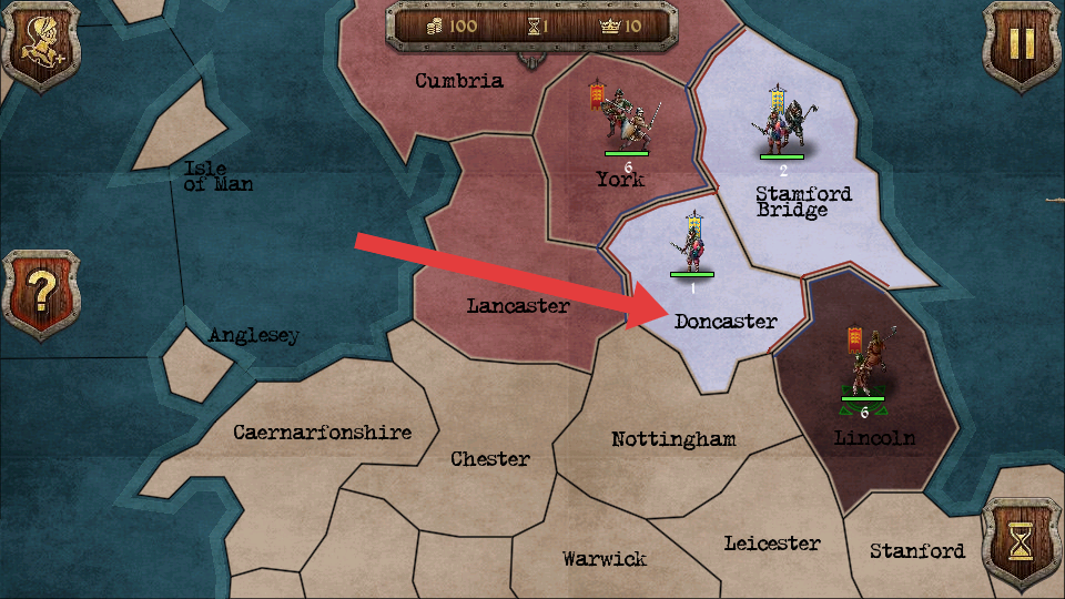 1、進(jìn)入游戲后,優(yōu)先點(diǎn)擊地圖上無(wú)主或敵方城鎮(zhèn)如York、Doncaster,成功占領(lǐng)后可獲取金幣資源,是后續(xù)招兵基礎(chǔ)。