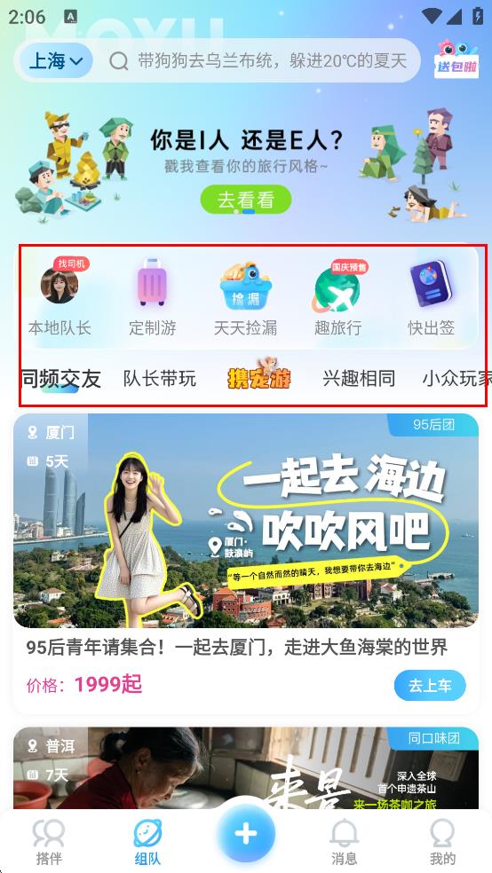 1、進(jìn)入組隊(duì)的界面,我們可通過(guò)本地隊(duì)長(zhǎng),定制游的入口,快速找到心儀旅行服務(wù)或旅游團(tuán)。
