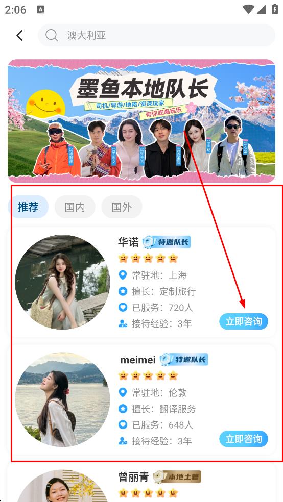 2、在本地隊(duì)長(zhǎng)的界面中,搜索目的地后,選合適的特邀隊(duì)長(zhǎng),點(diǎn)擊立即咨詢對(duì)接旅行服務(wù)。