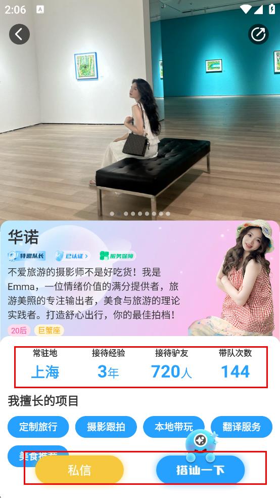 3、打開(kāi)隊(duì)長(zhǎng)詳情頁(yè),查看常駐地與接待經(jīng)驗(yàn)等多種信息,點(diǎn)私信或搭訕一下來(lái)溝通旅行。
