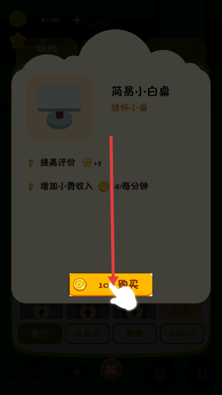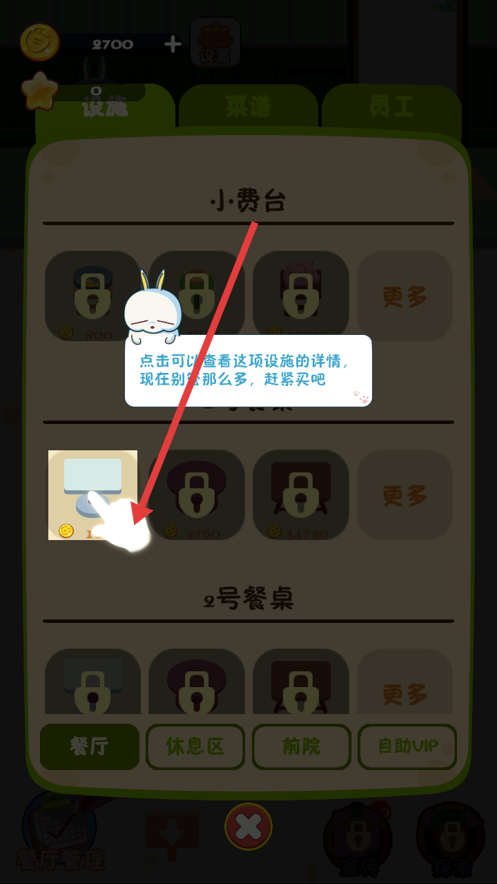 3、積累足夠資金后擴建餐廳空間,添置流氓兔主題裝飾提升環(huán)境等級,招聘員工分擔(dān)服務(wù)工作,解鎖高端菜品吸引VIP顧客擴大經(jīng)營規(guī)模。