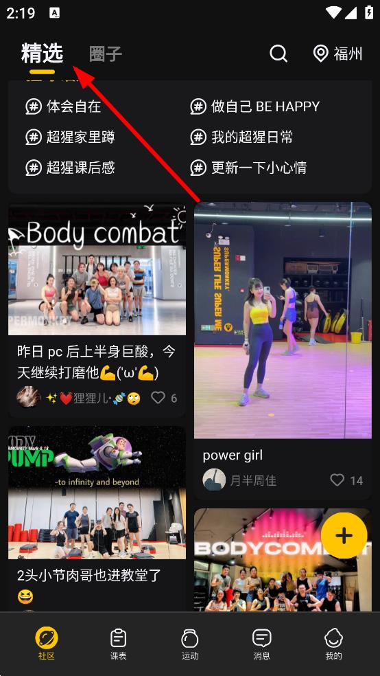 1、我們進(jìn)入社區(qū)界面后,可在精選的欄瀏覽各類健身相關(guān)動態(tài),獲取健身的靈感。