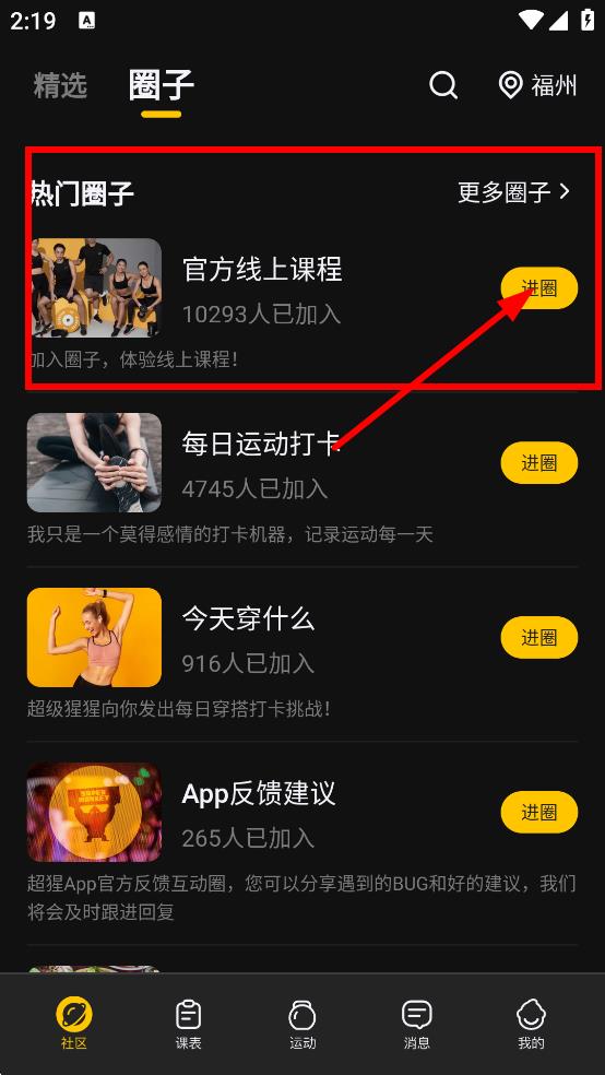 2、切換到圈子欄,找到熱門圈子里的官方線上課程,點擊右側(cè)進(jìn)圈的按鈕。