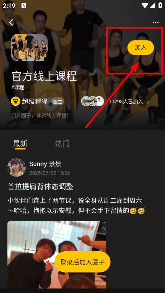 3、進(jìn)入官方線上課程圈子界面中,點擊右上角加入按鈕,即可加入該圈子,參與線上課程相關(guān)互動。