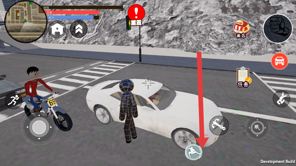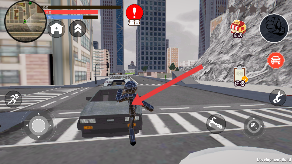 1、進(jìn)入游戲界面后,用左側(cè)搖桿操控網(wǎng)格火柴人移動,優(yōu)先熟悉界面按鈕拳頭攻擊、跑跳、載具召喚。