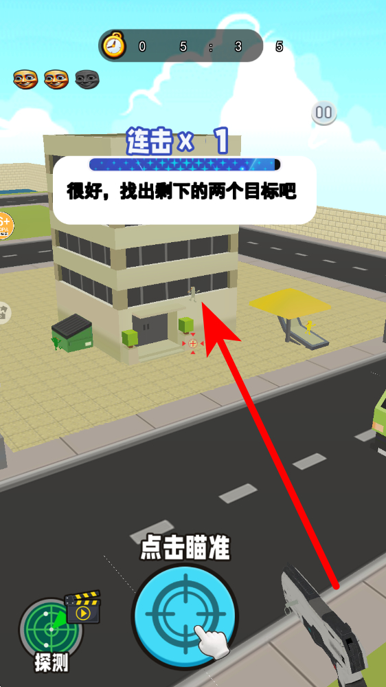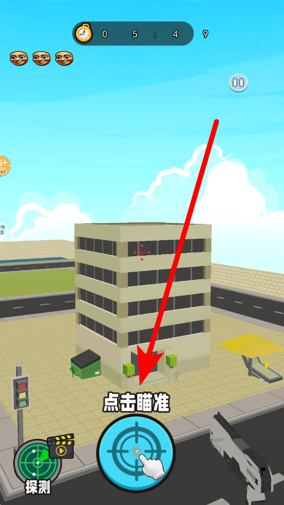 1、進(jìn)入主界面點(diǎn)擊開(kāi)始游戲,選定角色后進(jìn)入城市場(chǎng)景,熟悉點(diǎn)擊瞄準(zhǔn)探測(cè)按鍵,查看倒計(jì)時(shí)與目標(biāo)數(shù)量,為射擊行動(dòng)做籌備。