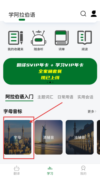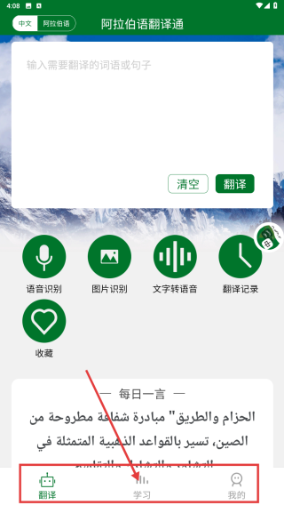1、打開阿拉伯語翻譯通,點擊底部學習按鈕,進入阿語學習模塊,開啟語言學習之旅。