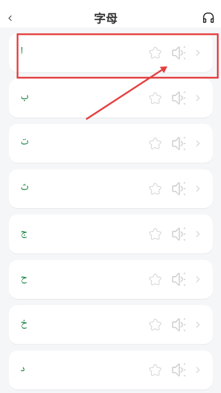 3、進入字母學習頁,點擊播放按鈕,收聽字母發(fā)音,跟讀練習,掌握阿語字母讀音規(guī)則。