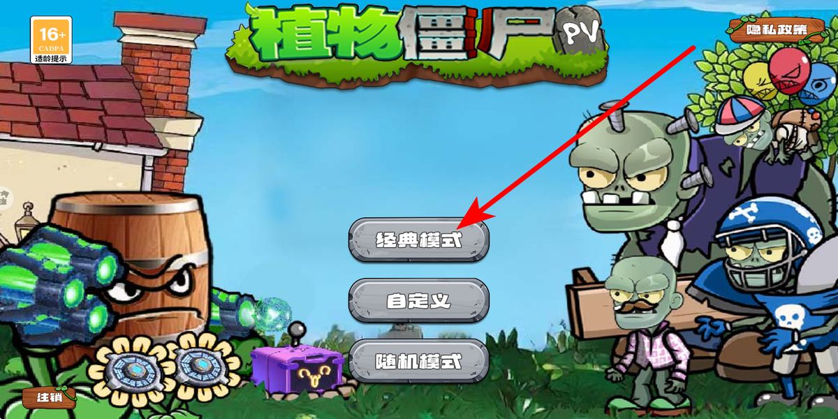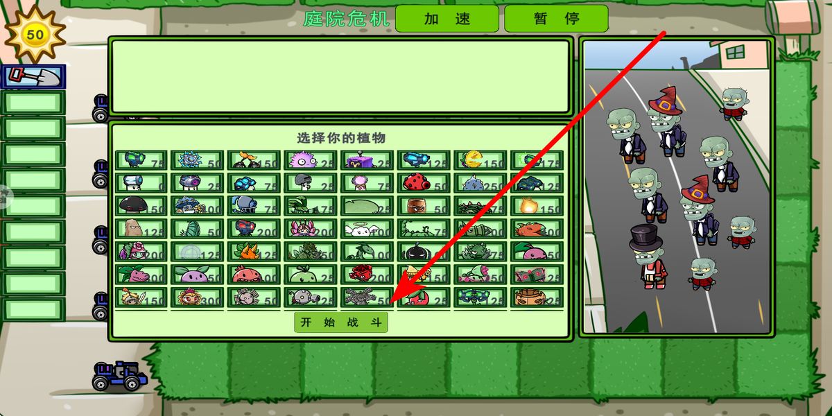 1、主界面點(diǎn)擊經(jīng)典模式,跳轉(zhuǎn)植物選擇頁(yè),依據(jù)初始陽(yáng)光50與僵尸類型,挑選攻擊、產(chǎn)陽(yáng)光植物,點(diǎn)擊開始戰(zhàn)斗進(jìn)入庭院危機(jī)戰(zhàn)局。