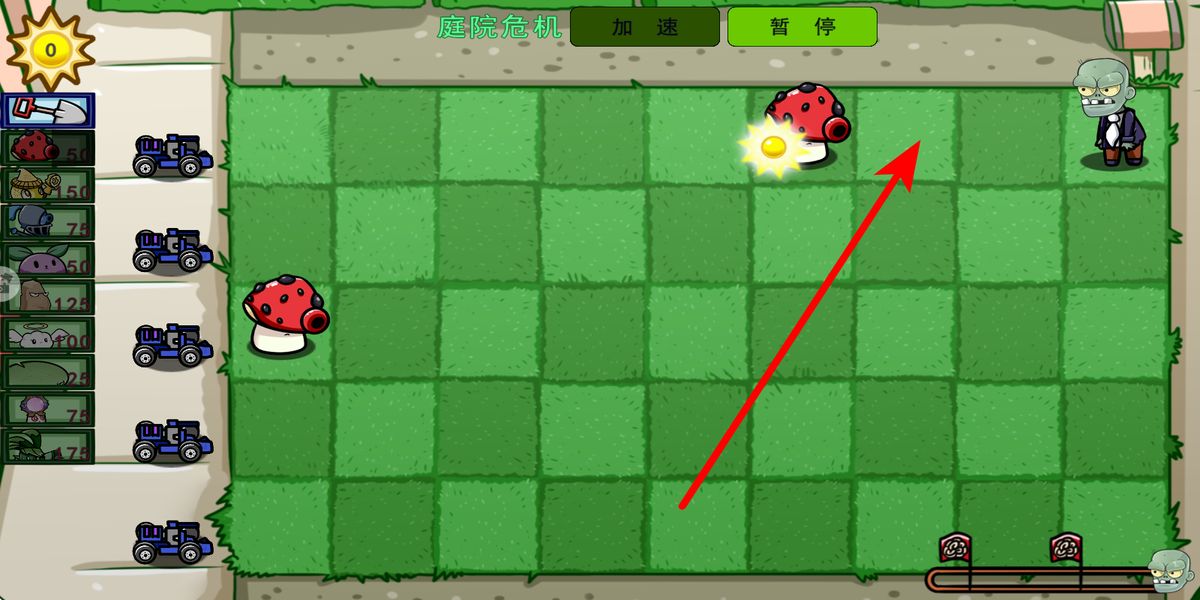 2、戰(zhàn)斗時(shí)優(yōu)先種植產(chǎn)陽(yáng)光植物界面左側(cè)植物,保障資源供給,再在前線格子布置攻擊植物蘑菇,阻擋僵尸推進(jìn),留意僵尸動(dòng)向調(diào)整種植位置。