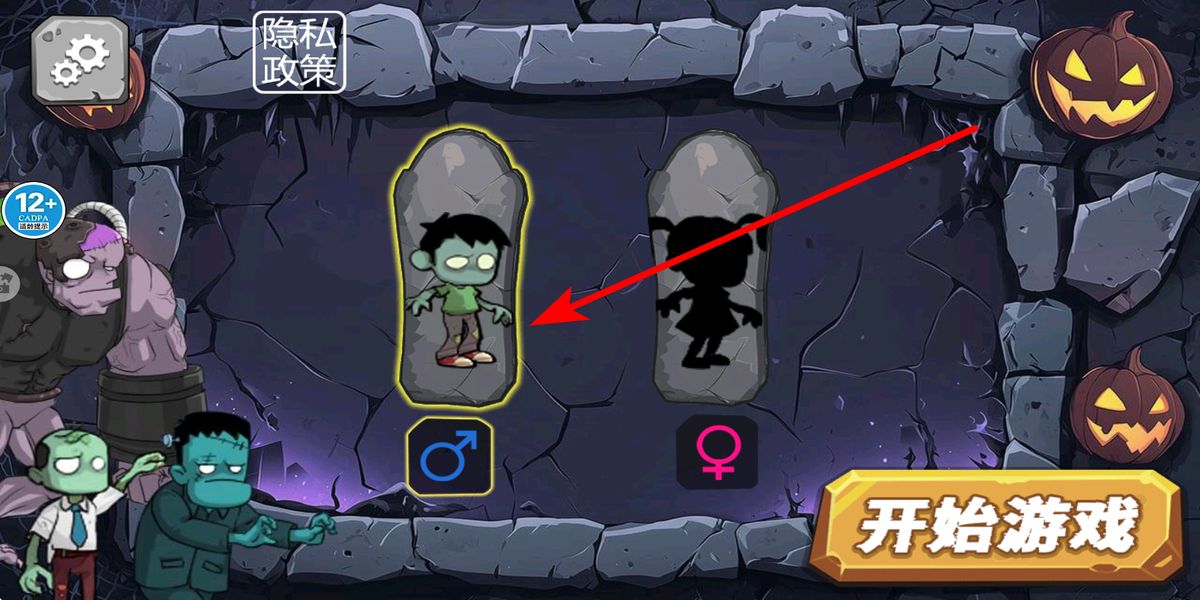 1、主界面點(diǎn)擊男女僵尸角色如左側(cè)男僵尸,確認(rèn)后點(diǎn)開始游戲,進(jìn)入場景,借虛擬操控移動(dòng),收集加速、無敵道具,為戰(zhàn)斗與生存蓄力。
