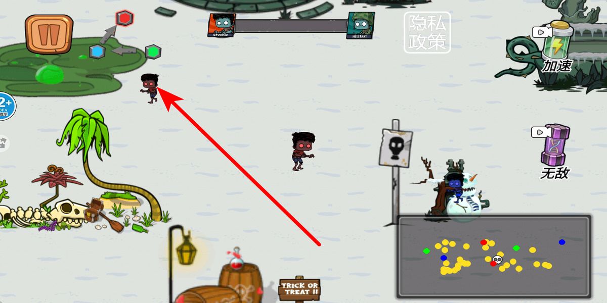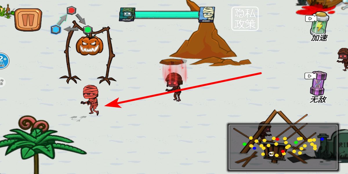 2、操控僵尸在場景移動(dòng),留意地形陷阱,遭遇南瓜怪、木乃伊等敵人時(shí),利用道具增益或近身攻擊對(duì)抗,把握時(shí)機(jī)閃避,維持戰(zhàn)斗節(jié)奏。