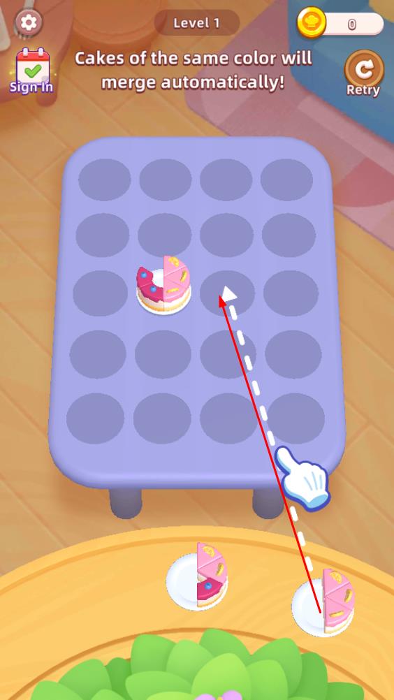 1、拖動下方蛋糕至網(wǎng)格空位,同色蛋糕自動合并,開啟合成進程,積累更高級蛋糕。