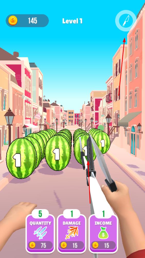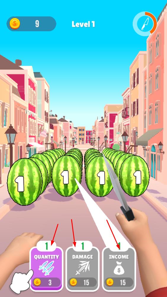 1、操控刀具砍擊前方標數(shù)西瓜,獲取金幣,開啟關(guān)卡挑戰(zhàn)進程。