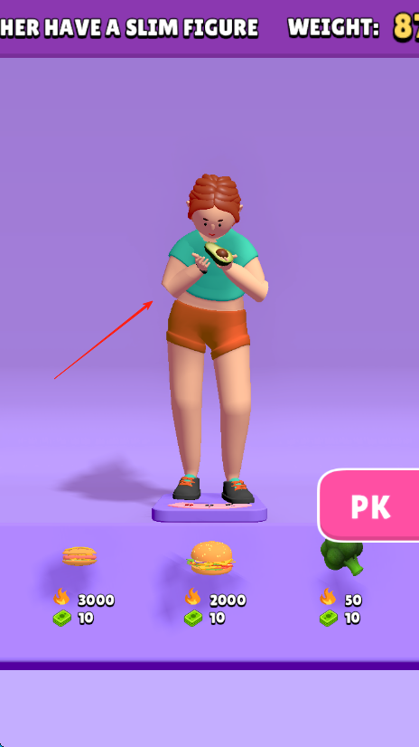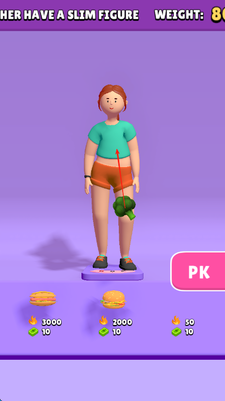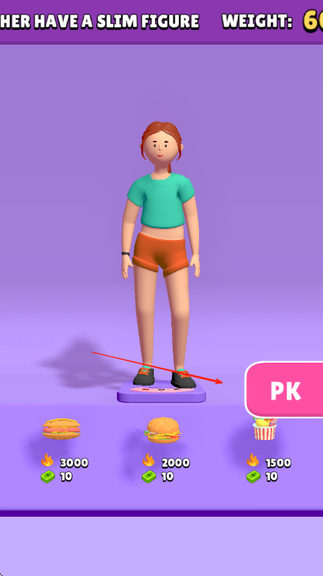 3、當(dāng)人物體重達(dá)到理想狀態(tài),點(diǎn)擊右側(cè)PK按鈕,參與身材比拼,和對(duì)手較量,依據(jù)體重及身材完成關(guān)卡挑戰(zhàn)。