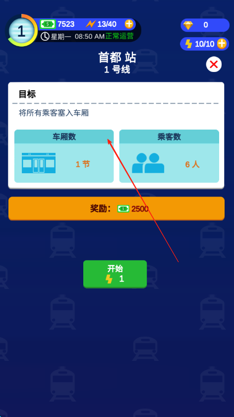 1、進(jìn)入游戲,在首都站1號線界面,查看目標(biāo)車廂數(shù)1節(jié)、乘客數(shù)6人,點(diǎn)擊綠色開始按鈕,消耗1能量開啟關(guān)卡。